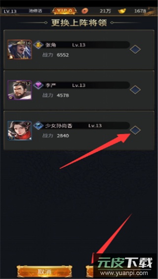 进入阵容界面后,选择需要下阵的武将,点击换将按钮;