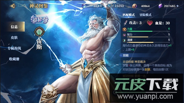 宙斯初始攻击力为3点,生命值30点,力量、智慧、速度三项初始属性分别为6、5、5。