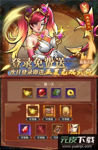 新区开放时,玩家每日登录即可领取日常奖励,登录天数越多,奖励越丰厚;特别是海量元宝、顶级武将、高级招募令和进阶材料等,都是非常重要的资源;第二天与第七天更有强力神将携带丰厚资源加入你的队伍。