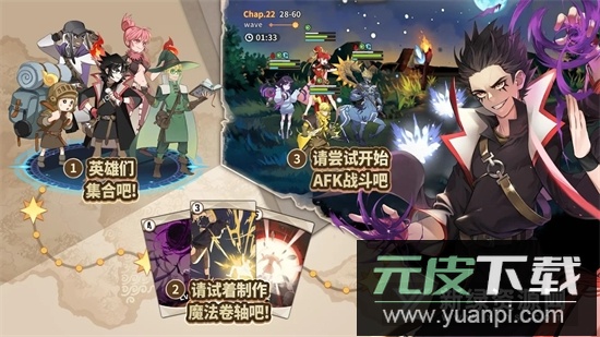 1.游戏由五位英雄与魔法卷轴共同构建自动对战体系;