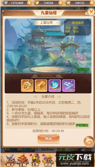 九重仙塔是游戏内的单人竞技活动。玩家可在此挑战其他武者,胜利后获得积分并晋升层数。抵达塔顶者可赢得“绝顶高手”称号与专属宝箱。