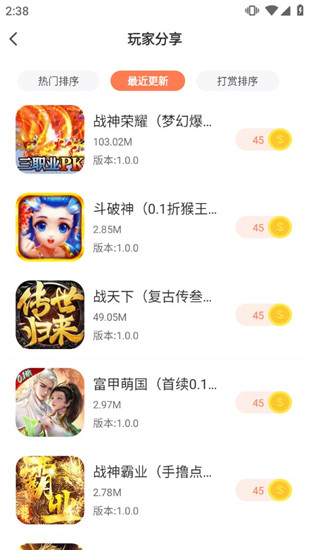 2、点击“玩家分享”区域,可以按热门程度、更新时间或打赏排名等顺序浏览内容;