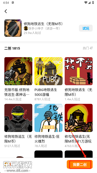 2、在页面右下角找到并点击“二创游戏”功能。