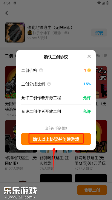 6、点击“我要二创”,同意相关协议后便可开始创建你的改编游戏。