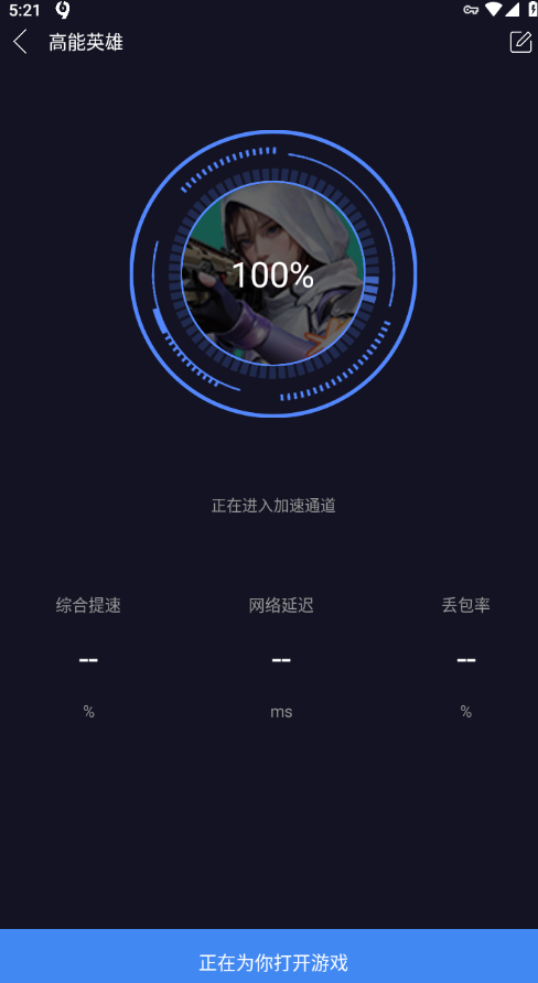 5. 此时软件将开始建立加速通道,当进度显示为100%时,页面会自动跳转,之后便可畅玩已加速的游戏。