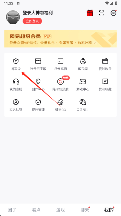 3、进入个人中心页面,在左上角可见将军令功能入口,点击即可使用。