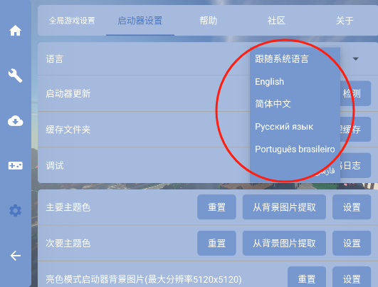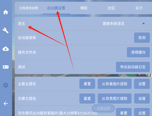 1、首先进入启动器的设置界面,找到语言选项。