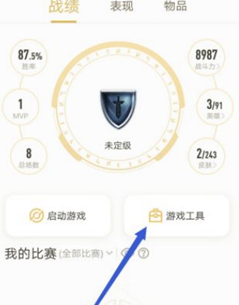 2、进入战绩界面后,可查看个人对战记录,点击页面中间的游戏工具按钮。