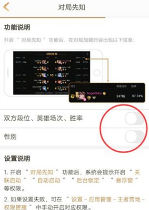 4、详情中包含显示双方段位、英雄场次、胜率及性别等开关,将其全部开启。