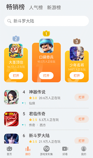 2、使用排行榜功能,比如畅销榜、人气榜、新游榜,探索当下最受欢迎的游戏;