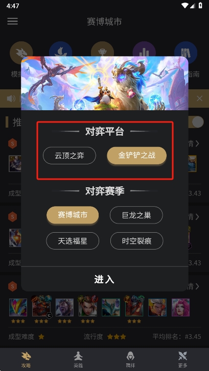 1、下载并打开应用,首先选择你所使用的对弈平台,点击进入。