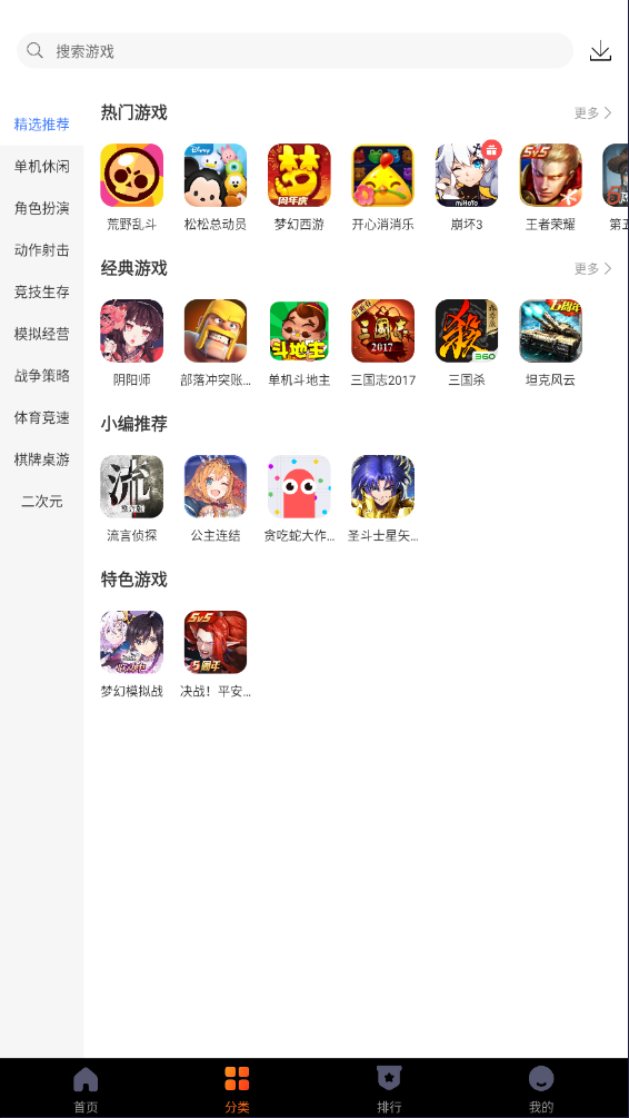 3、切换到分类页面可以看到详细的游戏分类,包含单机休闲、角色扮演、动作射击、竞技生存、模拟经营等不同赛道,只要是用户感兴趣的类型都能找到对应内容