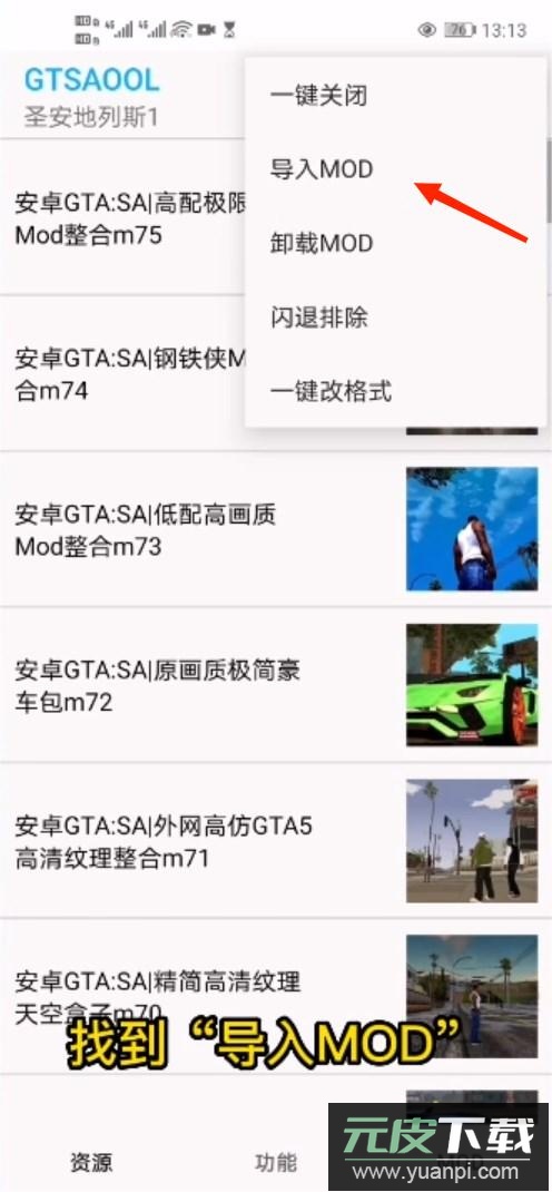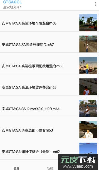 2. 软件会实时更新GTASA的最新整合包,用户可通过左上角菜单选项一键下载。需注意,使用整合包可能导致游戏闪退,若遇此情况可尝试在菜单中执行一键关闭或闪退排除操作。