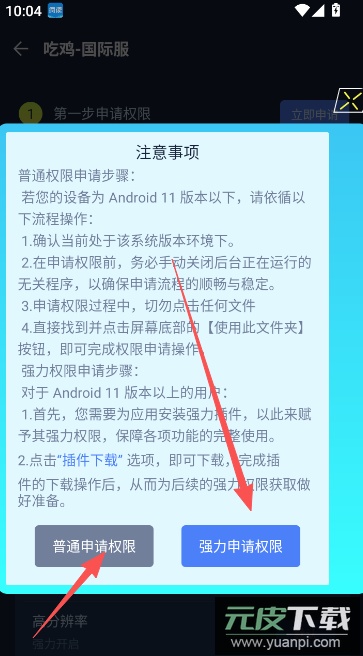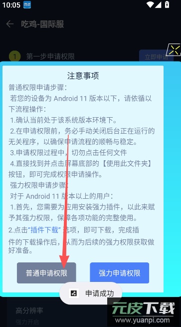 5、普通申请权限将直接成功;强力申请权限则需要下载相应插件。