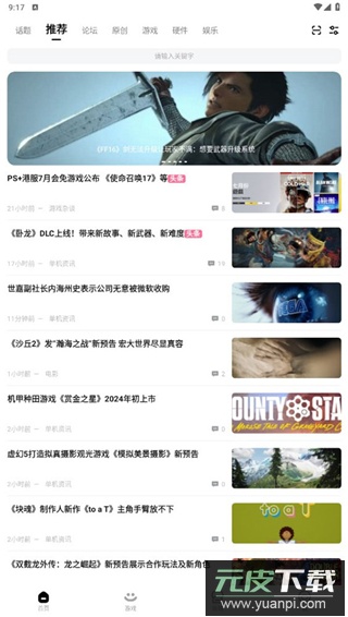 1、首页:首页分为话题、论坛、原创、游戏、硬件等栏目,用户可以在喜欢的分类下浏览内容、发表评论或分享自己的游戏帖子