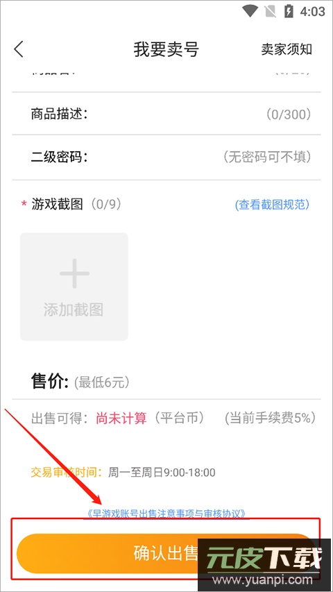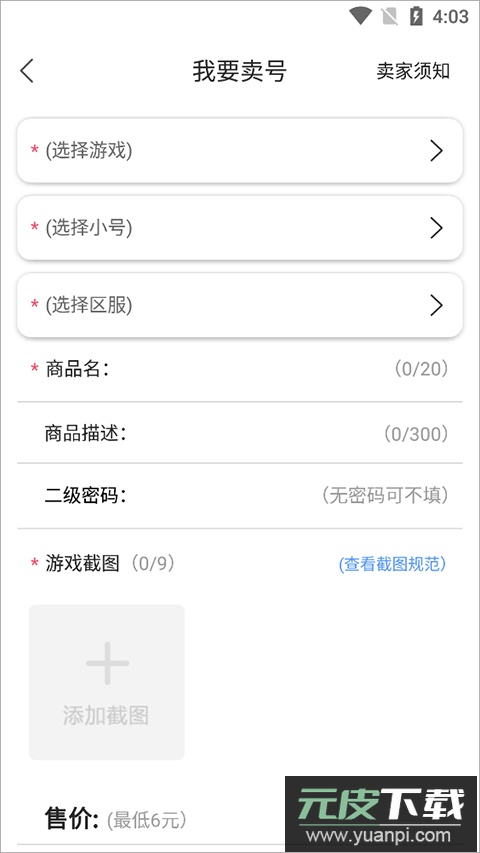 3、提交出售申请,填写游戏名称、小号信息、所属区服、商品名称并上传游戏截图;