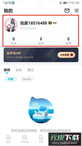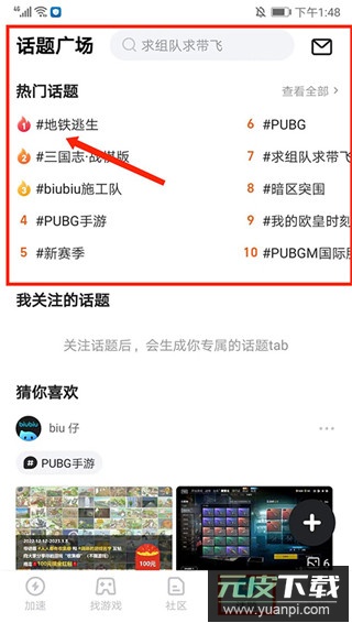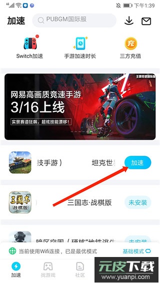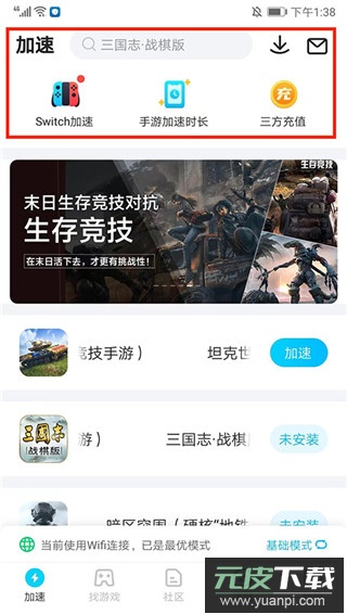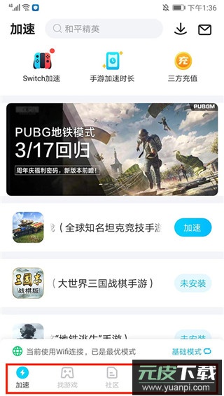 1、打开软件,登录后进入应用主界面,可看到一共分为【加速】、【找游戏】、【社区】、【话题】和【我的】栏目,