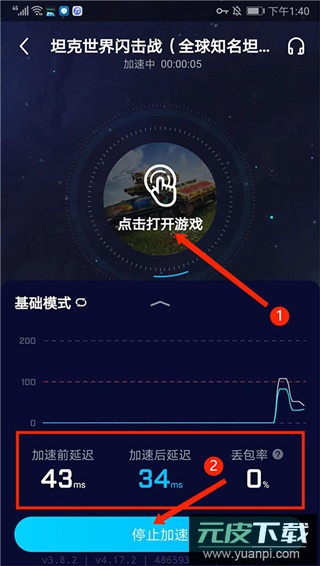 4、如图,已进入加速界面,可看到当前【加速延迟】和【丢包率】等详情信息,选择【点击打开游戏】可以进入游戏,如暂不需要,也可以选择下方【停止加速】,