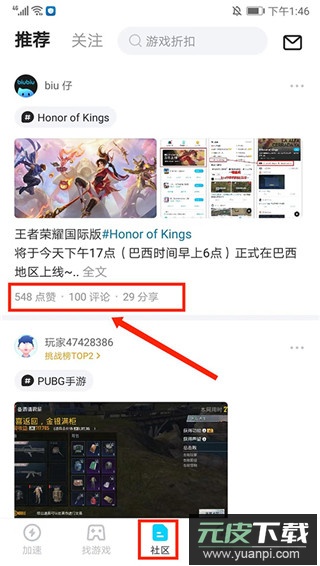 6、在【社区】界面,用户可以浏览游戏相关的公告、教程、攻略以及最新的一些资讯,并且可以进行点赞、评论和分享,