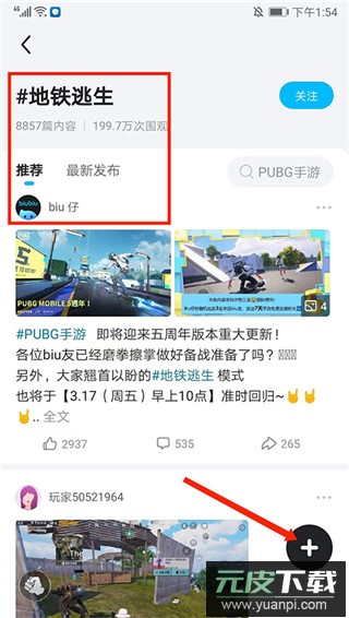 8、如图,可以看到相应话题的【推荐】和【最新发布】内容,选择右下方【+号】图标,可进发布话题,