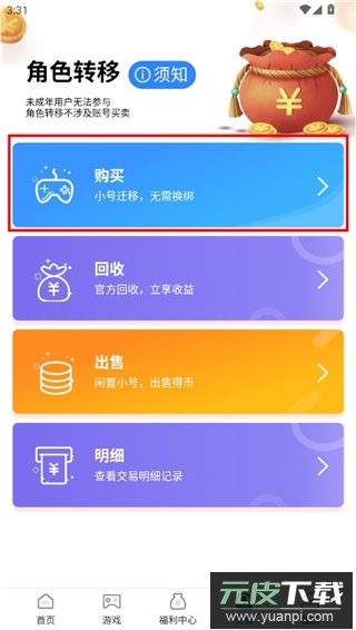 二、在交易界面能看到购买、回收、出售和明细四项功能,选择购买;