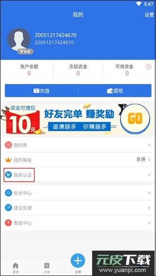 1、登录账号后,在主界面下方点击“我的”入口,找到“陪练认证”选项;