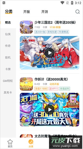 3、在分类页面中,可以看到精选、仙侠、传奇、放置、卡牌、GM特权及充值卡等多种游戏类别;