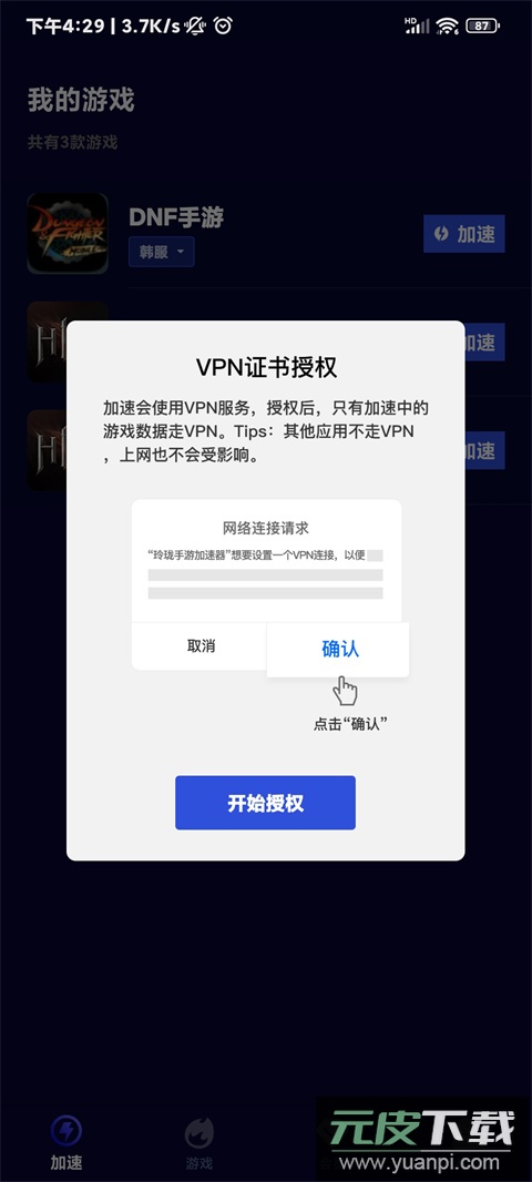 2. 启动应用,在首页的个人游戏列表中选择需要加速的游戏,并按照提示完成授权;