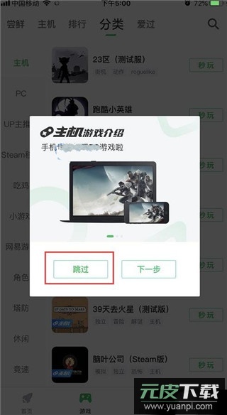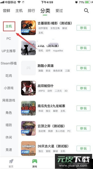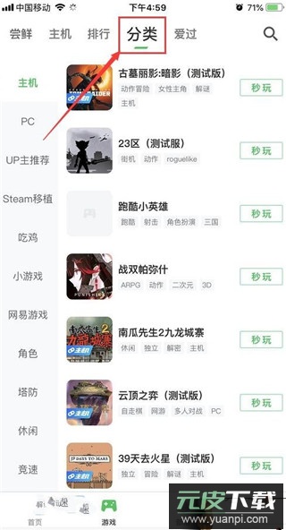 2、点击顶部的分类标签,进入游戏分类页面;