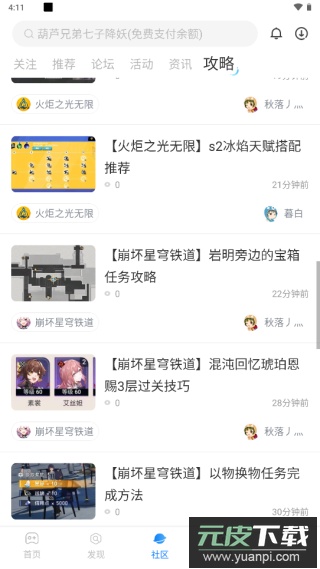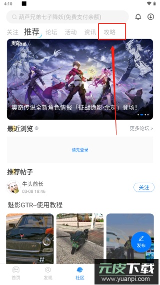 2、在社区页面中选择“攻略”栏目;
