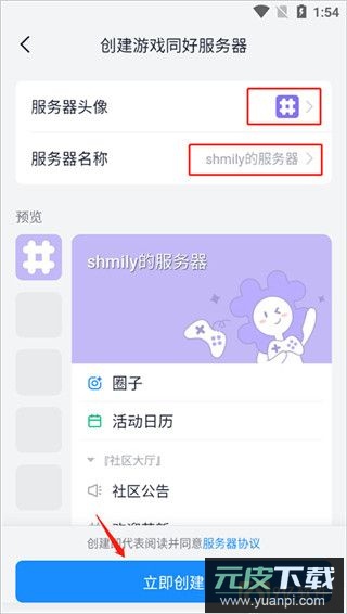 3、点击下方“立即创建”按钮,上方支持自定义服务器头像与名称。