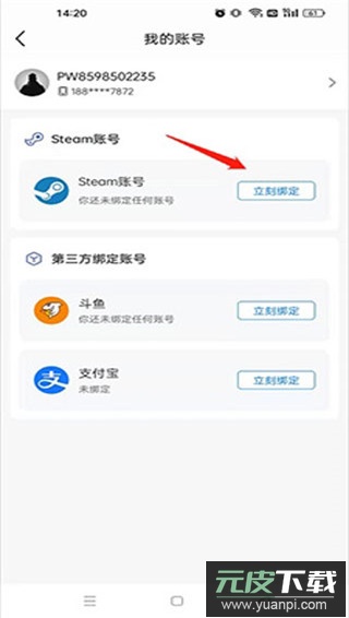 进入账号页面后,选择“立即绑定”即可开始绑定Steam账户。