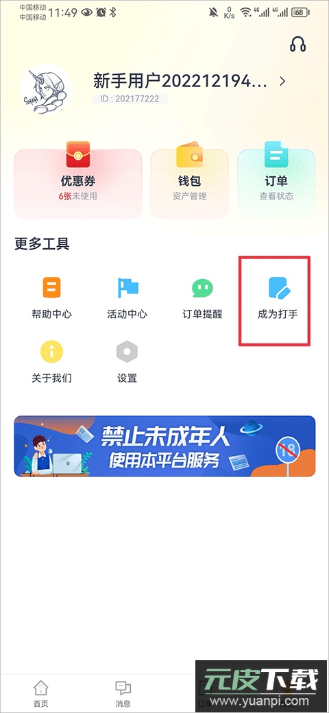首先,打开代练猫应用,在“我的”页面中选择“注册成为代练”。