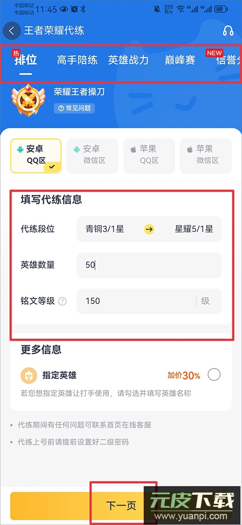 3、选择游戏后将进入服务类型页面,你可以根据需求选取代练排位、专业陪练、巅峰赛或赏金联赛等服务;若选择代练排位,需填写相关代练信息后点击“下一步”继续。