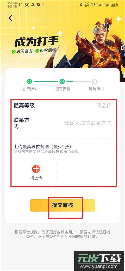 接着,填写你的游戏最高段位与联系方式,并上传段位截图等资料,提交后等待平台审核;审核通过后,你就可以正式开启代练服务。