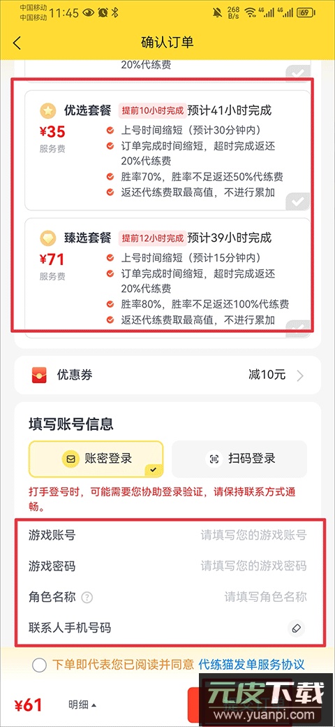 4、在订单确认页面选择所需服务套餐,完整填写游戏账号信息,随后提交订单并完成支付,即可成功创建代练任务。