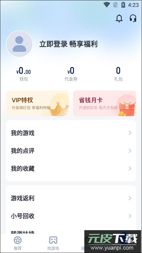 登录个人账号后,可进行游戏充值返利、小号回收操作以及跨游戏福利转换等管理。