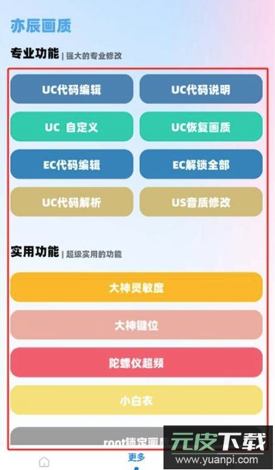 前往更多页面,还可以使用UC代码编辑、大神灵敏度配置、陀螺仪超频等功能,深度定制你的游戏操作体验。
