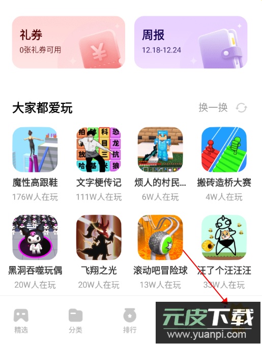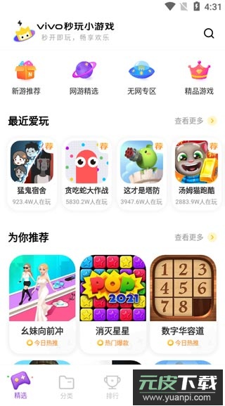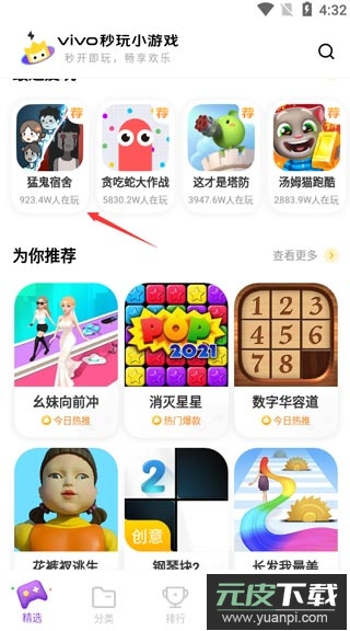 2、在精选区域,无论是近期热门的猛鬼宿舍,还是经典游戏贪吃蛇大作战,或是刚刚上线的新款小游戏,这里都能找到;