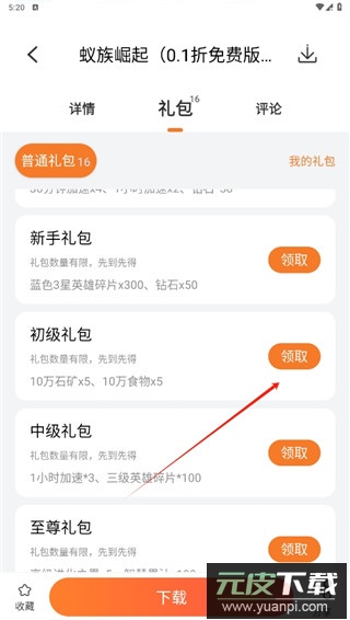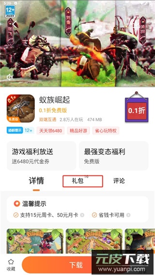 2、进入该游戏的详情介绍页,点击页面上的礼包选项。